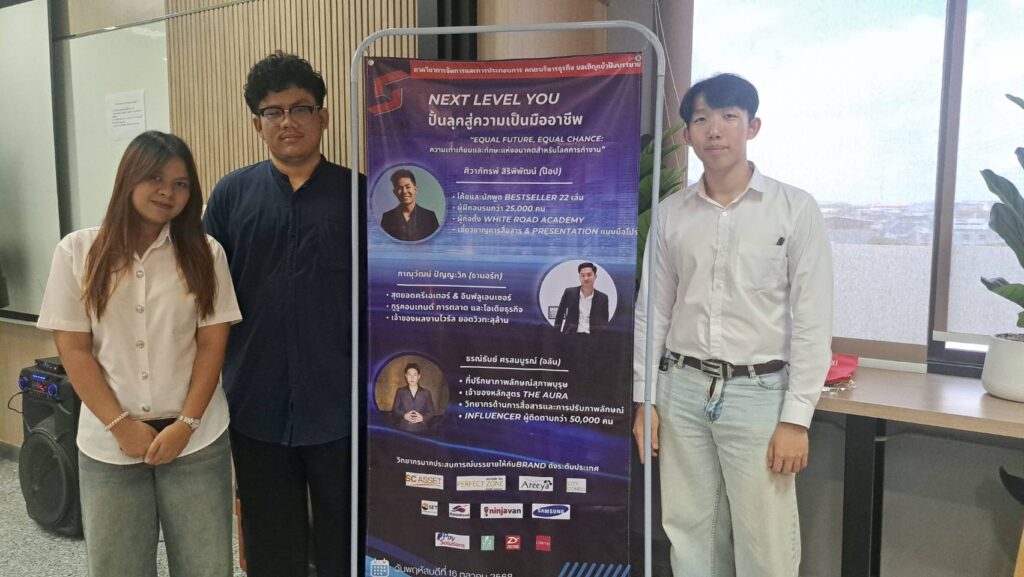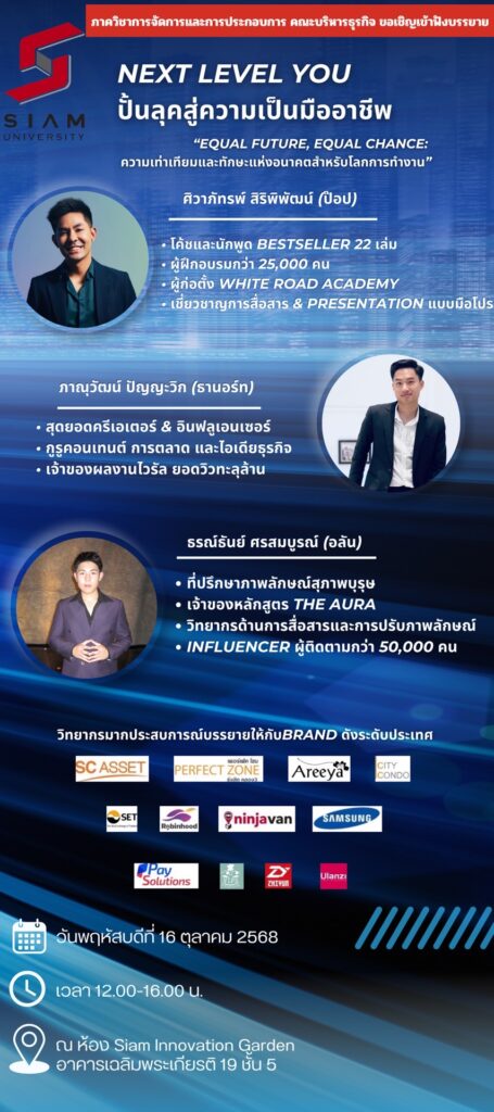 ภาควิชาการจัดการและการประกอบการ จัดการอบรมในหัวข้อ “NEXT LEVEL YOU: ปั้นลุคสู่ความเป็นมืออาชีพ” โดยมี 3 วิทยากรสุดปัง มาแชร์เคล็ดลับการสื่อสาร การตลาด และการสร้างภาพลักษณ์ ซึ่งจัดขึ้นเมื่อวันที่ 16 ตุลาคม 2568 ณ ห้อง Siam Innovation Garden อาคาร 19 มหาวิทยาลัยสยาม